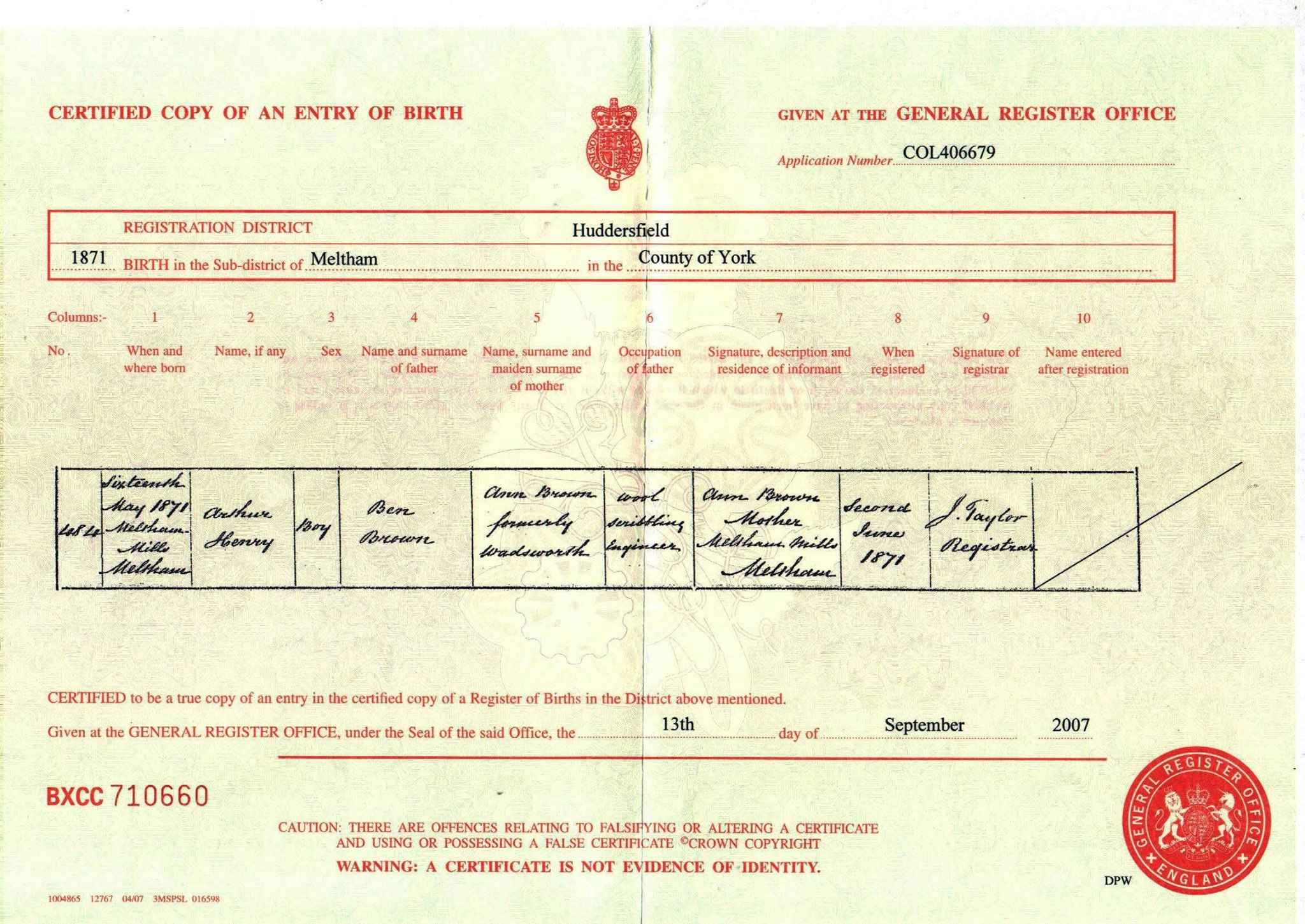Birth Certificate, Huddlesfield, Metham, County of York, England